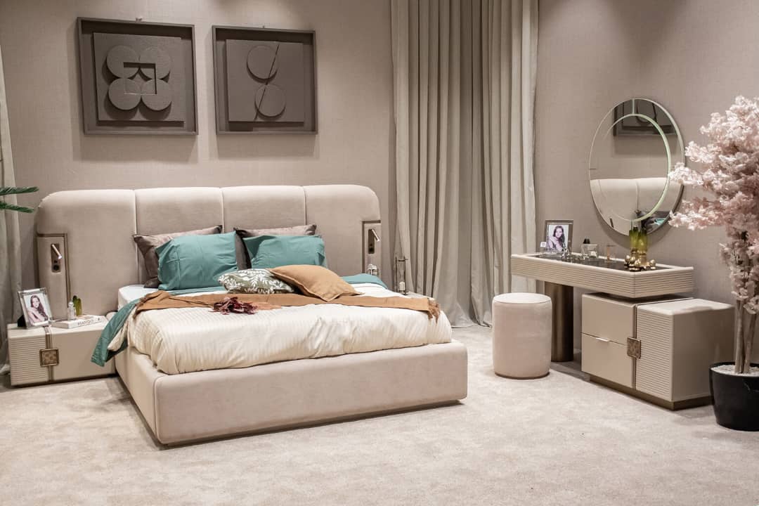 تشكيلة عصرية متكاملة تضم سرير 180×200 مع التخزين، 2 كوميدينو، زيانة مع بوف، حاملة أدراج، ودولاب 6 أبواب. تصميم عملي وجودة عالية لخيار مثالي لغرفة نومك.